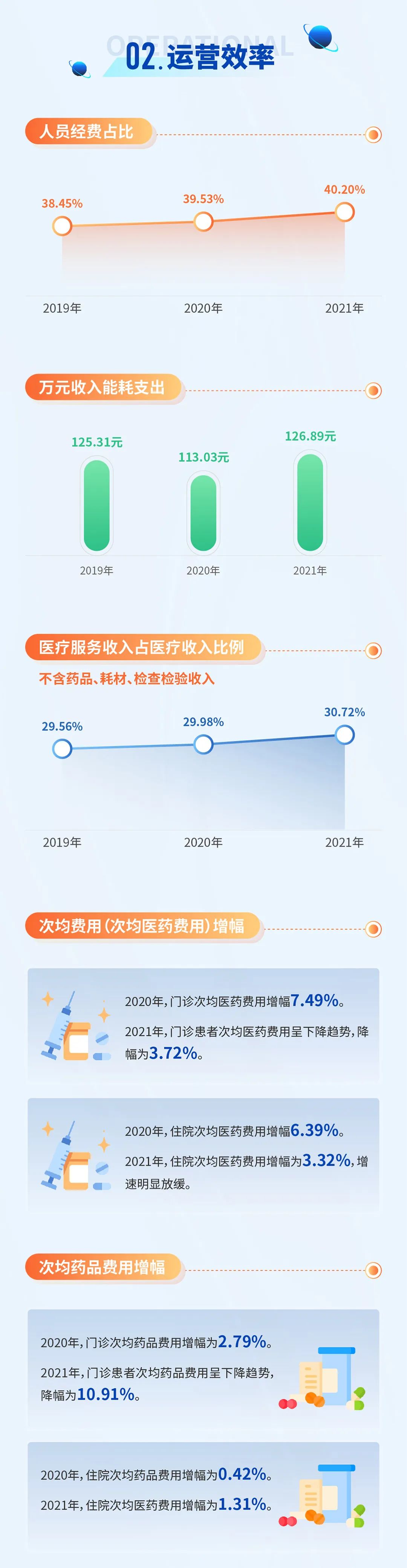 (三) 运营能力有所增强。在收支结构方面,2021年,全国二级公立医院医疗服务收入(不含药品、耗材、检查检验收入)占医疗收入比例(30.72%)、人员经 费占比(40.20%)均较2020年有所提升,重点监控药品收入占比(1.12%)、重点监控高值医用耗材收入占比(30.45%)较2020年均有所 下降,医务人员劳务价值进一步体现,二级公立医院“腾笼换鸟”调结构取得积极成效。在次均费用方面,与2020年相比,2021年全国二级公立医院门诊患 者次均医药费用和次均药品费用均呈下降趋势,降幅分别为3.72%和10.91%。在收治的疑难复杂疾病患者不断增加的同时,二级公立医院出院患者次均医 药费用增幅为3.32%,出院患者次均药品费用增幅为1.31%,增速明显放缓。