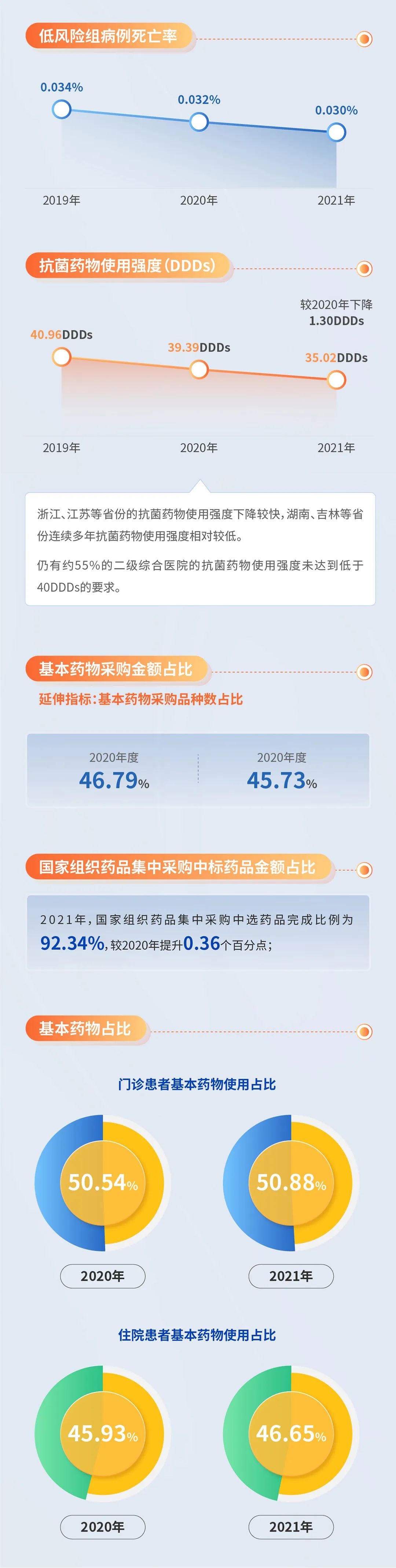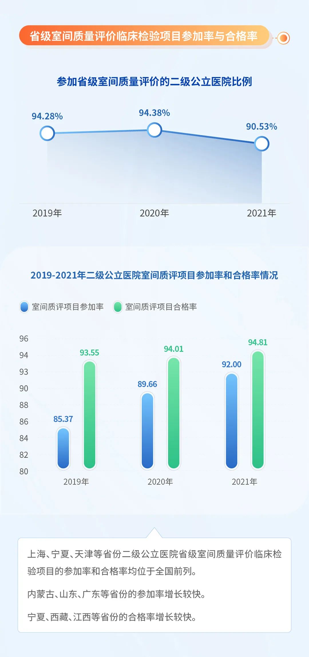 (二) 诊疗支撑能力持续提升。一是合理用药水平不断提高。2021年,全国二级公立医院抗菌药物使用强度为35.02DDDs,较2020年下降 1.30DDDs;抗菌药物使用强度超过40DDDs的综合医院比例较2020年下降3.83个百分点,浙江、江苏等省份的抗菌药物使用强度下降较快,湖 南、吉林等省份连续多年抗菌药物使用强度相对较低。国家组织药品集中采购中选药品完成比例为92.34%,较2020年提升0.36个百分点;门诊患者基 本药物处方占比和住院患者基本药物使用占比分别为50.88%和46.65%,较2020年提高0.34个和0.72个百分点,二级公立医院进一步落实优 先配备使用基本药物政策要求。二是检查检验同质化水平稳步提高。2021年,90.53%的二级公立医院参加了所在省份临床检验中心组织的室间质量评价工 作,省级室间质量评价临床检验项目参加率中位数为92.00%,合格率中位数为94.81%,较2020年分别提升2.34个和0.80个百分点(见图 3),为有效推进医疗机构检查检验结果互通互认奠定了较好基础。上海、宁夏、天津等省份二级公立医院省级室间质量评价临床检验项目的参加率和合格率均位于 全国前列,内蒙古、山东、广东等省份的参加率增长较快,宁夏、西藏、江西等省份的合格率增长较快。三是信息化建设和应用水平稳中有进。2021年,全国 88.40%的二级公立医院参加了电子病历系统应用水平分级评价,平均级别达到2.60级,较2020年略有提高。其中,60.36%的二级公立医院的电 子病历系统应用水平分级达到3级及以上,基本满足部门间数据交换的要求;二级公立医院中电子病历系统应用水平达到的最高级别为5级,占比约为0.3%,主 要集中在山东、上海等省份。在信息化建设和应用方面,上海、浙江、河南、山东、贵州等省份基础较好,青海、山西、西藏等省份提升速度较快。