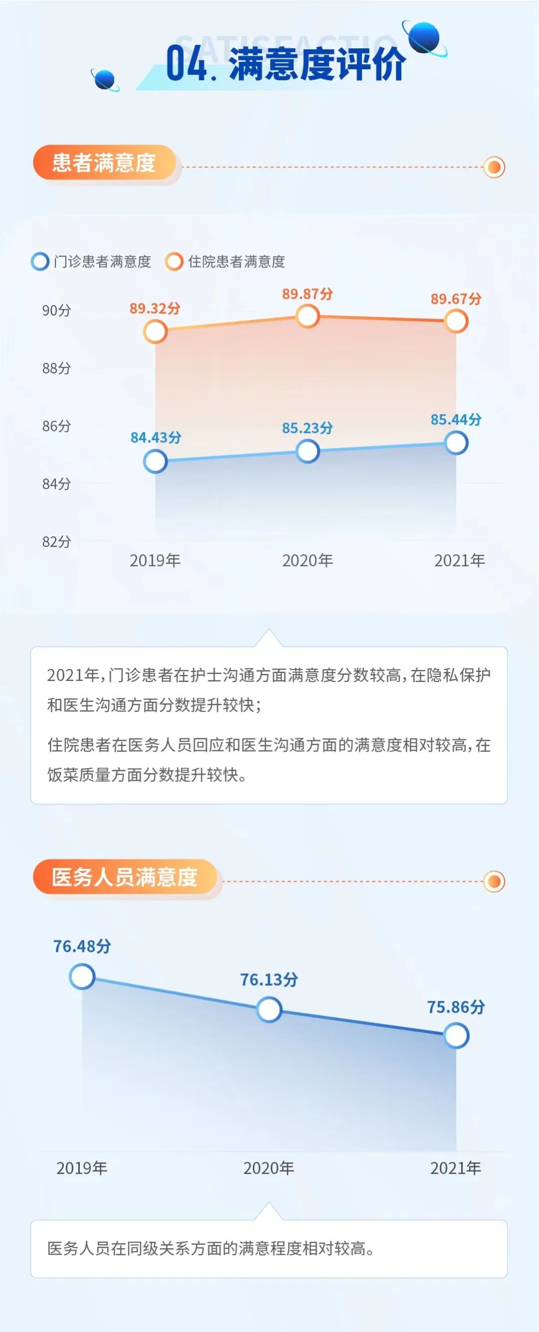 (五)群众满意度稳中有升。在患者满意度方面,2021 年,全国二级公立医院门诊患者满意度为85.44分,较2020年增加0.21分,住院患者满意度为89.67分,与2020年相比基本持平。门诊患者在 护士沟通方面满意度分数较高,在隐私保护和医生沟通方面分数提升较快;住院患者在医务人员回应和医生沟通方面的满意度相对较高,在饭菜质量方面分数提升较 快。二级公立医院积极巩固进一步改善医疗服务行动计划工作成效,通过开设综合服务窗口,优化手续办理流程,提升患者就医便捷程度;通过调整诊室布局,为患 者提供更加宽敞和有序的就医场所;通过加强诊区环境整治和卫生间卫生管理,确保就医环境的干净整洁、安全舒适;个别医院上线了膳食医嘱管理软件,在满足医 嘱要求的同时兼顾营养搭配和个人口味。在医务人员满意度方面,2021年,医务人员满意度得分为75.86分,与2020年相比基本持平, 在同级关系方面的满意程度相对较高。部分二级公立医院要求职能科室深入临床科室听取意见建议,及时解决医务人员工作中遇到的实际问题;通过开展员工子女假 期托班、为员工父母免费体检等,努力解决员工后顾之忧。
