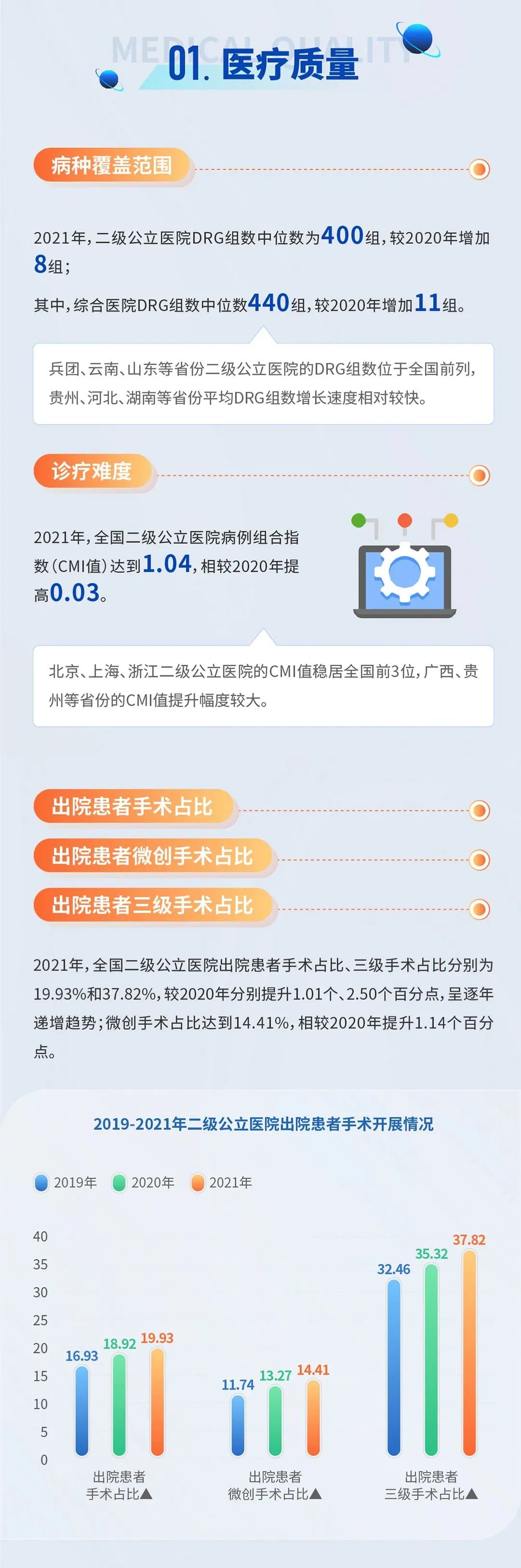 (一)临床服务能力持续提升。一 是诊疗范围稳步扩展。2021年,全国二级公立医院收治住院患者中,以心脑血管疾病和呼吸系统疾病中的常见多发疾病患者为主,符合二级公立医院功能定位。 同时,二级公立医院诊疗病种覆盖范围逐年增加,2021年二级公立医院DRG组数中位数为400组,较2020年增加8组;其中,综合医院DRG组数中位 数440组,较2020年增加11组。兵团和云南、山东等省份二级公立医院的DRG组数位于全国前列,贵州、河北、湖南等省份平均DRG组数增长速度相对 较快。二是技术难度持续提升。2021年,全国二级公立医院出院患者手术占比、三级手术占比分别为19.93%和37.82%(见图2),较2020年分 别提升1.01个、2.50个百分点,呈逐年递增趋势,部分二级公立医院逐步开展了具有一定难度的手术。全国二级公立医院反映疾病复杂程度的病例组合指数 (CMI值)达到1.04,相较2020年提高0.03。其中,北京、上海、浙江二级公立医院的CMI值稳居全国前3位,广西、贵州等省份的CMI值提升 幅度较大。三是服务模式创新发展。2021年,全国二级公立医院微创手术占比达到14.41%,相较2020年提升1.14个百分点(见图2),在提升疾 病综合诊疗水平和患者医疗服务舒适性方面作出积极探索,腹腔镜和胸腔镜下操作等微创手术在更多医院得到应用。此外,全国二级公立医院低风险组病例死亡率为 0.03%,较2020年略有下降。
