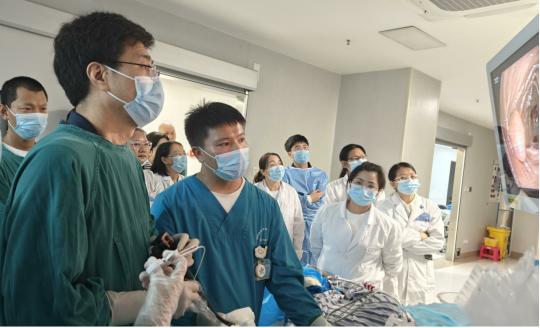宁守斌教授率先操作,为一例黑斑息肉综合征患者实施小肠巨大息肉切除术,成功切除直径超过1cm的息肉30余枚,操作娴熟,过程精彩。他特别演示了如何在保证安全的前提下切除多枚息肉,并向学员们详细讲解了出血防控及术中技巧。